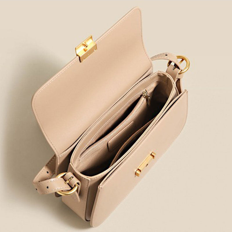 The leather saddle bag features multiple pockets inside, key lock closure, 2 wide shoulder strap with different length, each strap is adjustable in length.